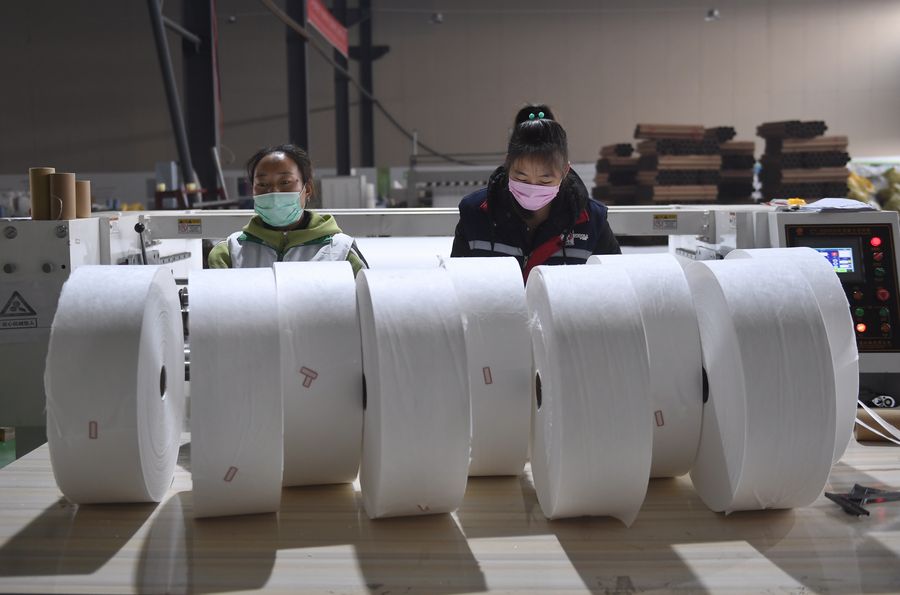 Technicians arrange melt-blown nonwovens at a workshop of a new material company in Chengdu, southwest China's Sichuan Province, Feb 12, 2020. The demand for face masks has witnessed a large increase since the outbreak of the novel coronavirus infection (COVID-19). (Xinhua/Liu Kun)