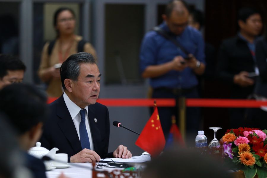 Chinese State Councilor and Foreign Minister Wang Yi addresses the Special ASEAN-China Foreign Ministers' Meeting on Coronavirus Disease in Vientiane, capital of Laos, Feb. 20, 2020. (Xinhua/Kaikeo Saiyasane)