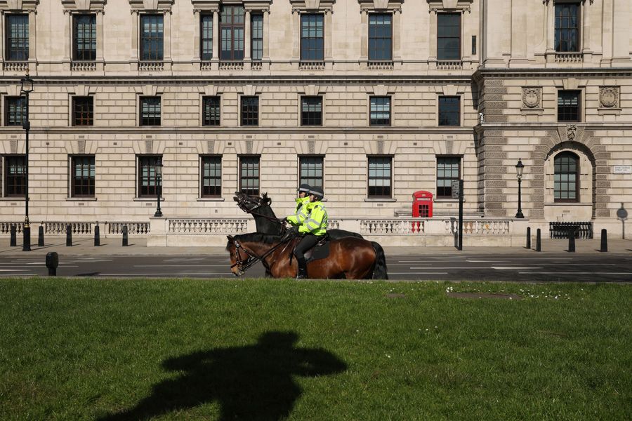 Police ride horses through Parliament Square in London, Britain, March 25, 2020. (Photo by Tim Ireland/Xinhua)