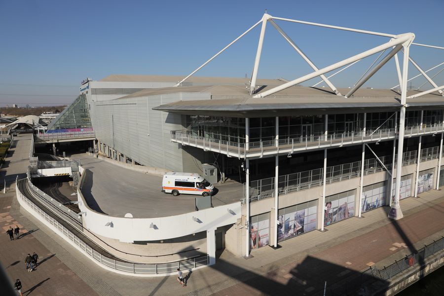 A man walks by the ExCel exhibition centre in London, Britain, March 25, 2020. (Photo by Tim Ireland/Xinhua)■