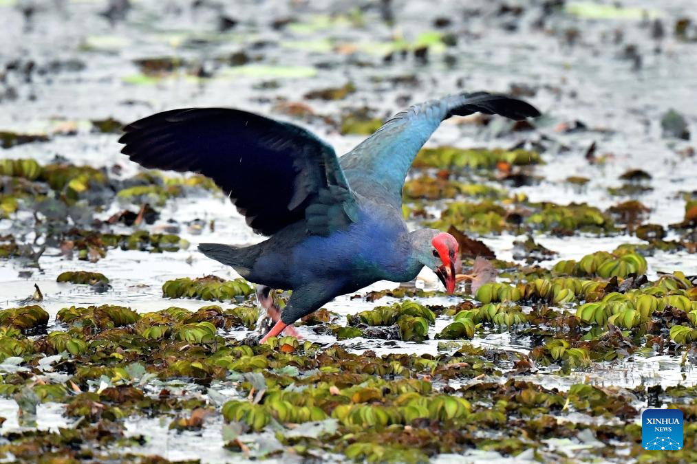 A gray-headed swamphen is pictured in a wetland area near Colombo, Sri Lanka, on Feb. 15, 2026. (Photo by Ajith Perera/Xinhua)
