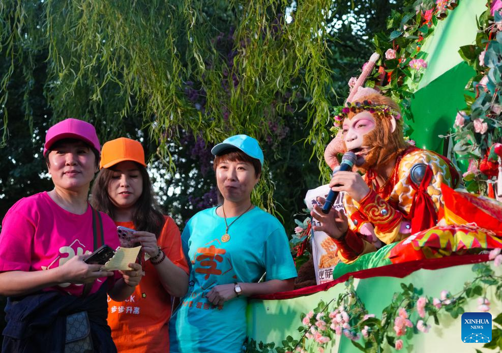 Wang Qingfeng acting as the "Xuebing Monkey", or rice-cracker monkey, performs at the Changchun Zoological and Botanical Park in Changchun, northeast China's Jilin Province, Aug. 14, 2025. (Xinhua)