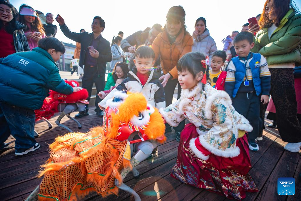 A child interacts with a robot dog at a wetland park in Xinghua City, east China's Jiangsu Province, Feb. 19, 2026. During the Spring Festival, various folk activities and performances are held across China. (Photo by Zhou Shegen/Xinhua)