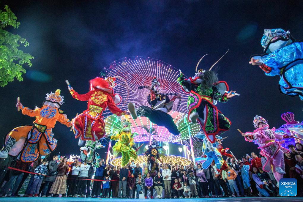 Members of a Yingge team perform at a park in Gaoming District of Foshan City, south China's Guangdong Province, Feb. 19, 2026. China's Ministry of Culture and Tourism launched a month-long cultural and tourism campaign ahead of the Spring Festival, featuring a wide range of activities and promotional measures to better meet people's needs.
