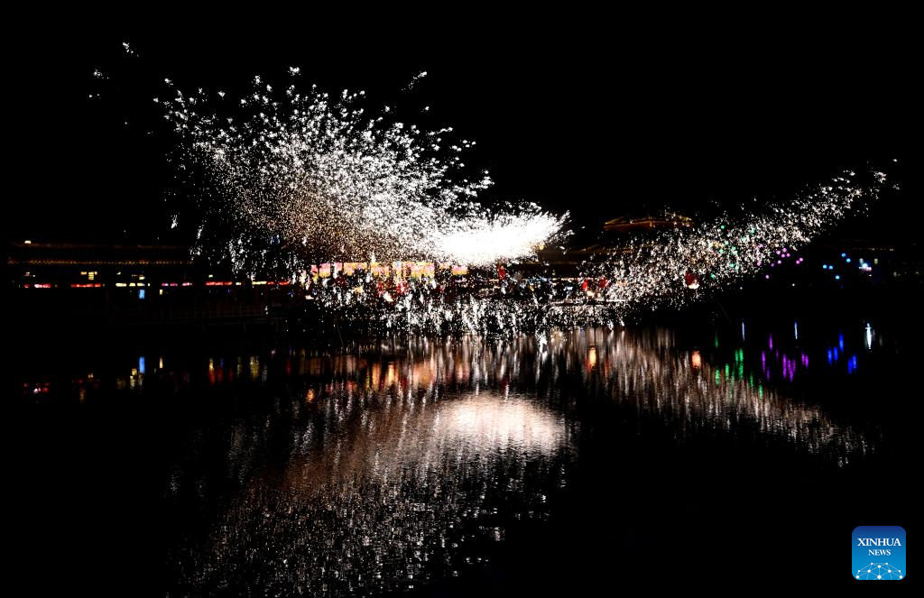 A molten iron firework performance is staged at a temple fair in Shangqiu City, central China's Henan Province, Feb. 19, 2026. China's Ministry of Culture and Tourism launched a month-long cultural and tourism campaign ahead of the Spring Festival, featuring a wide range of activities and promotional measures to better meet people's needs.