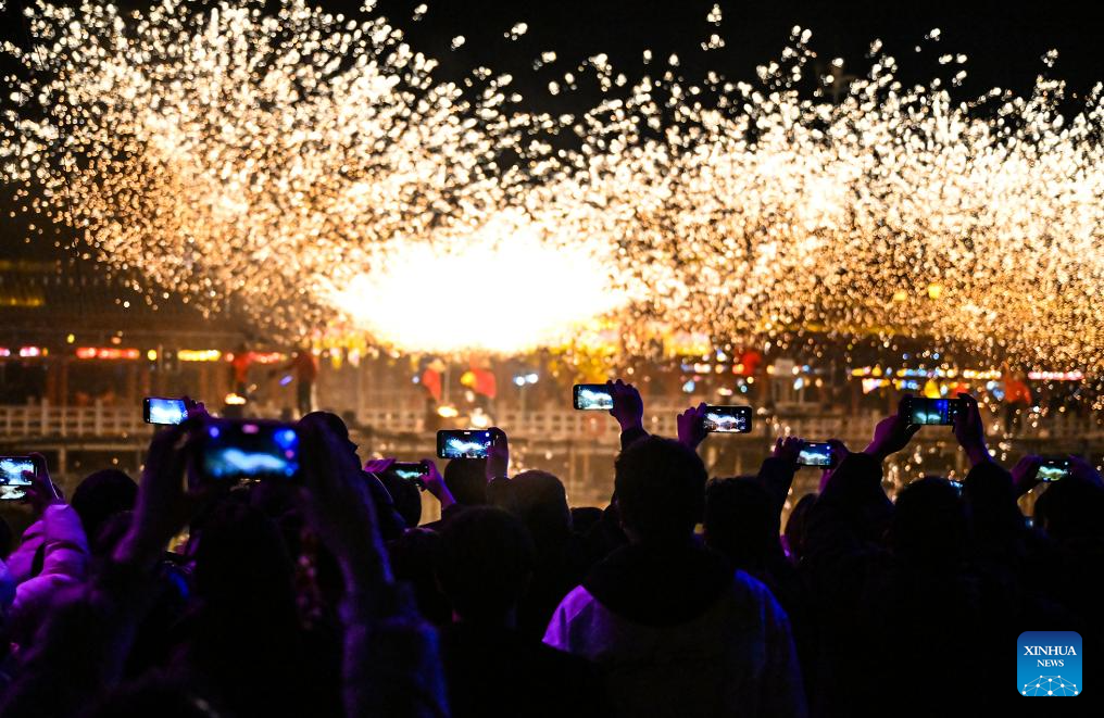 Tourists watch molten iron fireworks at a temple fair in Shangqiu City, central China's Henan Province, Feb. 19, 2026. China's Ministry of Culture and Tourism launched a month-long cultural and tourism campaign ahead of the Spring Festival, featuring a wide range of activities and promotional measures to better meet people's needs.