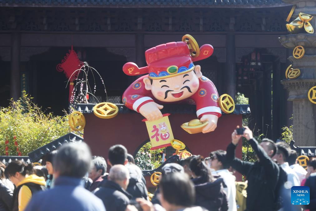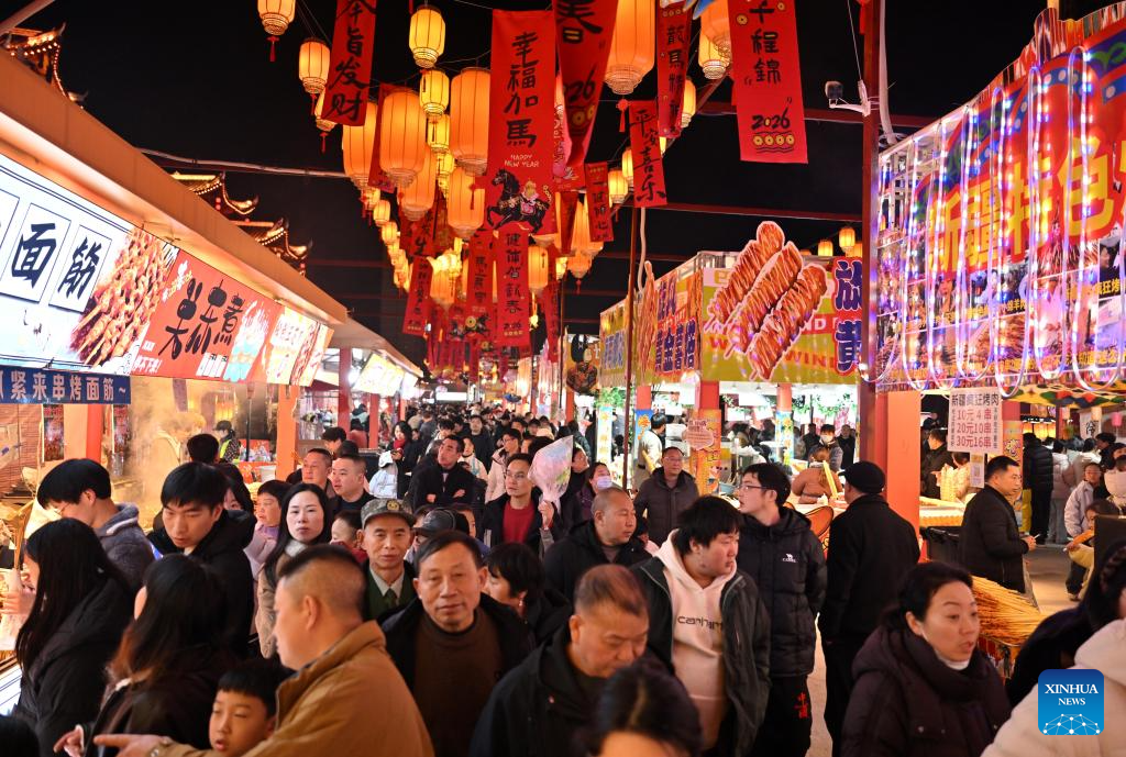 Tourists visit a latern exhibition at a temple fair in Shangqiu City, central China's Henan Province, Feb. 19, 2026. China's Ministry of Culture and Tourism launched a month-long cultural and tourism campaign ahead of the Spring Festival, featuring a wide range of activities and promotional measures to better meet people's needs.