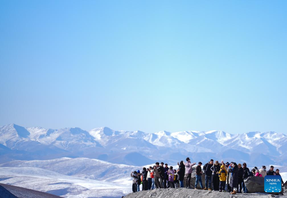 Tourists have fun on a snow mountain in Menyuan Hui Autonomous County in Haibei Tibetan Autonomous Prefecture, northwest China's Qinghai Province, Feb. 20, 2026. China's Ministry of Culture and Tourism launched a month-long cultural and tourism campaign ahead of the Spring Festival, featuring a wide range of activities and promotional measures to better meet people's needs.