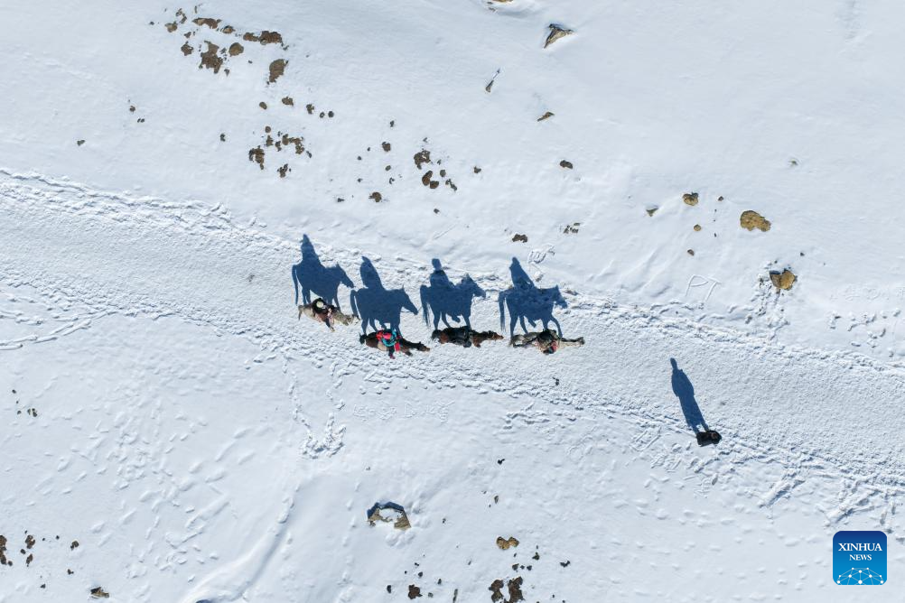 An aerial drone photo shows tourists riding horses on a snow mountain in Menyuan Hui Autonomous County in Haibei Tibetan Autonomous Prefecture, northwest China's Qinghai Province, Feb. 20, 2026. China's Ministry of Culture and Tourism launched a month-long cultural and tourism campaign ahead of the Spring Festival, featuring a wide range of activities and promotional measures to better meet people's needs.