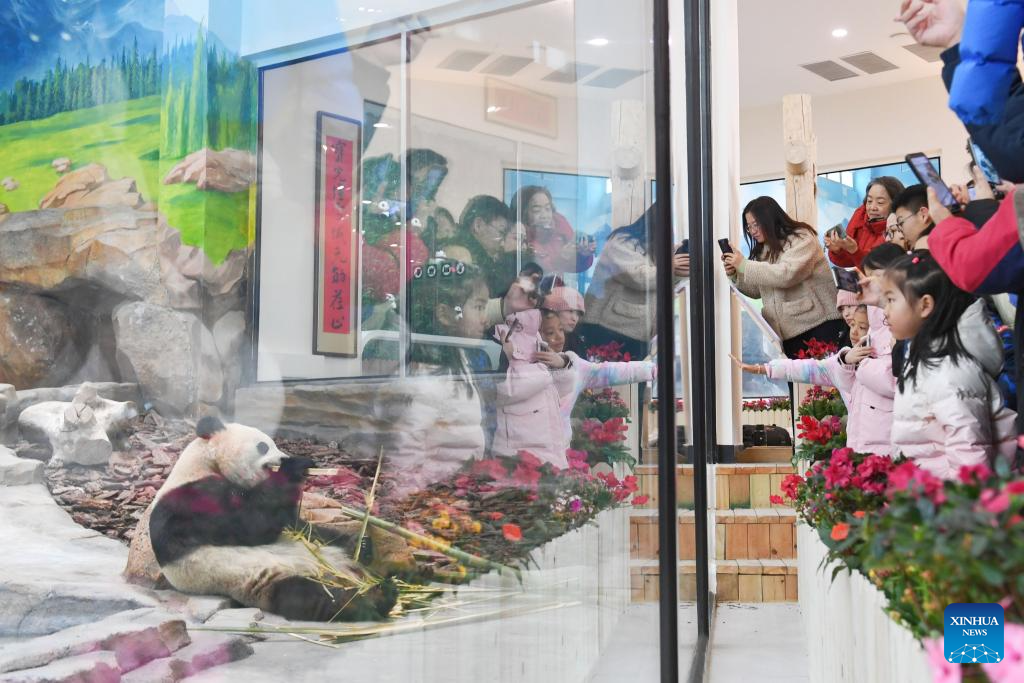 Tourists take photos of the giant panda Baoyuan at a zoo in Urumqi, northwest China's Xinjiang Uygur Autonomous Region, Feb. 20, 2026. China's Ministry of Culture and Tourism launched a month-long cultural and tourism campaign ahead of the Spring Festival, featuring a wide range of activities and promotional measures to better meet people's needs.
