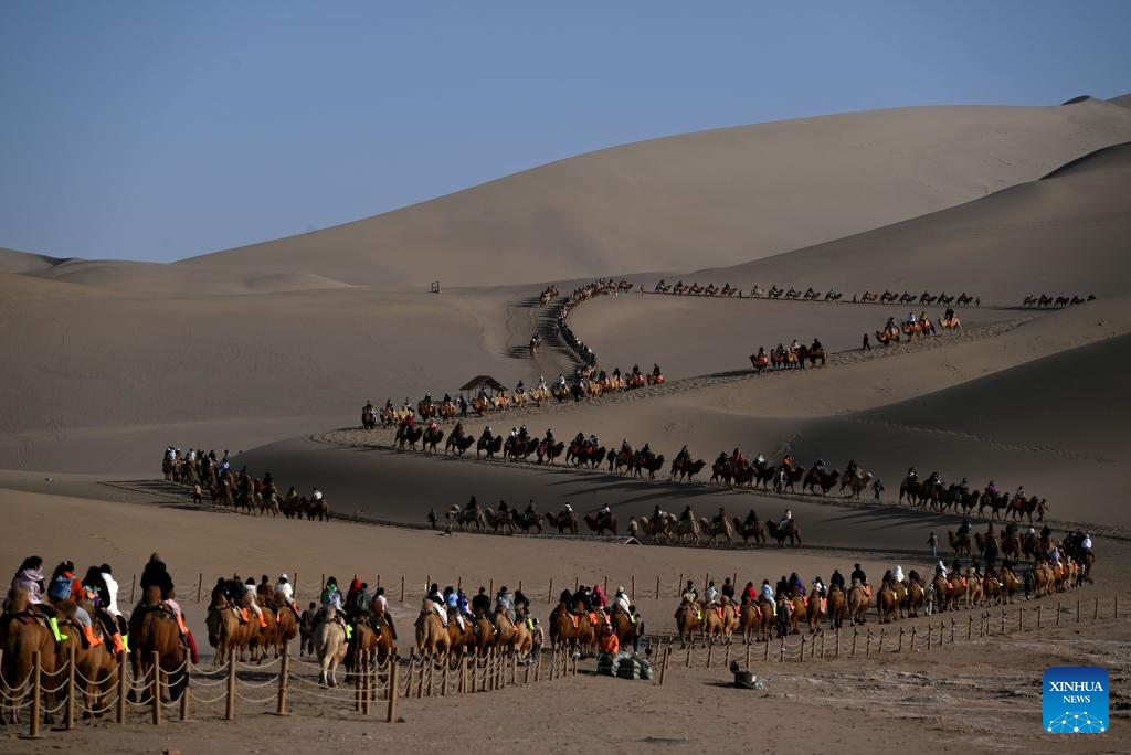 Tourists visit the Mingsha Mountain and Crescent Spring Scenic Area in Dunhuang City, northwest China's Gansu Province, Feb. 19, 2026. China's Ministry of Culture and Tourism launched a month-long cultural and tourism campaign ahead of the Spring Festival, featuring a wide range of activities and promotional measures to better meet people's needs.