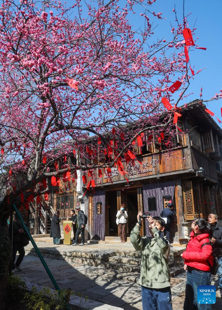 Tourists enjoy the scenery of plum blossoms at the Puyuan Fashion Resort in Tongxiang City of Jiaxing, east China's Zhejiang Province, Feb. 20, 2026. China's Ministry of Culture and Tourism launched a month-long cultural and tourism campaign ahead of the Spring Festival, featuring a wide range of activities and promotional measures to better meet people's needs.