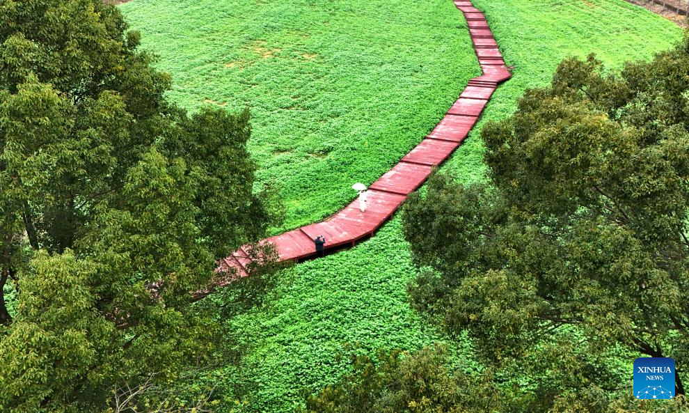An aerial drone photo taken on Feb. 19, 2026 shows tourists visiting a garden in Xincheng County of Laibin City, south China's Guangxi Zhuang Autonomous Region. China's Ministry of Culture and Tourism launched a month-long cultural and tourism campaign ahead of the Spring Festival, featuring a wide range of activities and promotional measures to better meet people's needs.