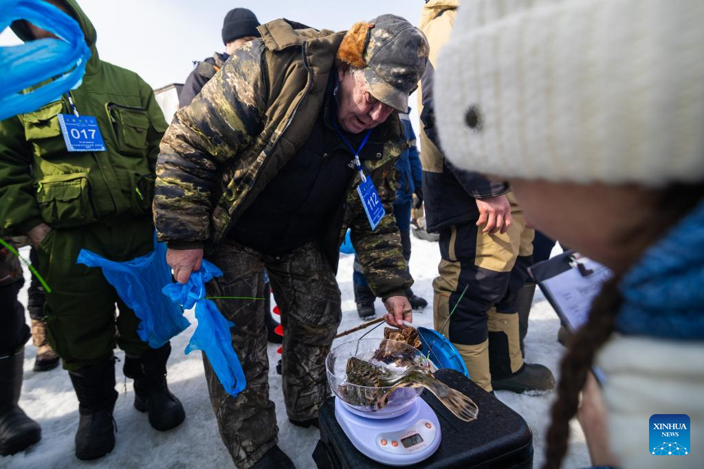 A man participating in an ice fishing competition hands over his catches to the referees for weighing in Vladivostok, Russia, Feb. 21, 2026. (Photo by Andrey Matveenko/Xinhua)