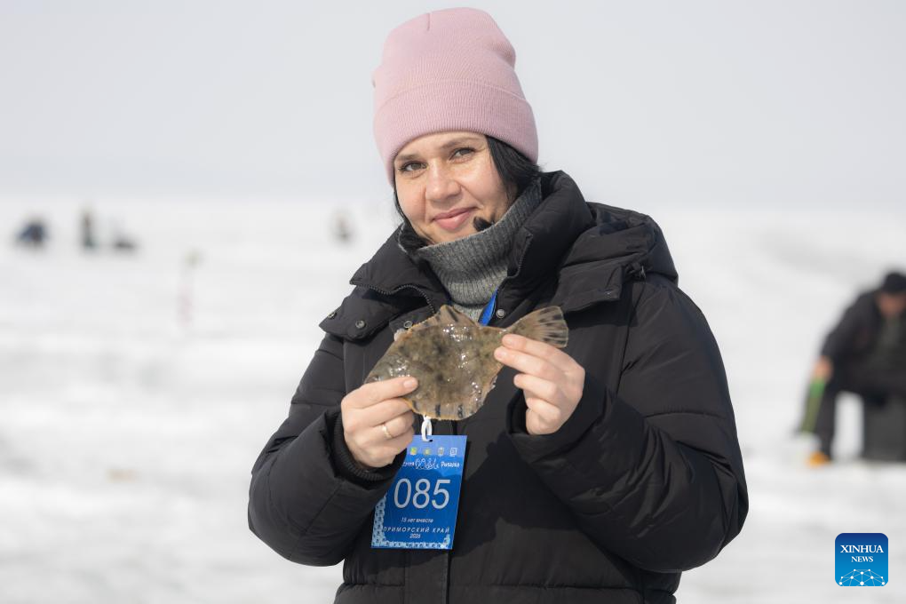 A woman shows the fish she caught in an ice fishing competition in Vladivostok, Russia, Feb. 21, 2026. (Photo by Andrey Matveenko/Xinhua)