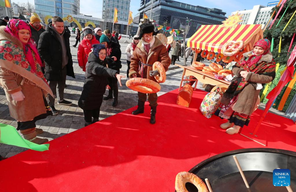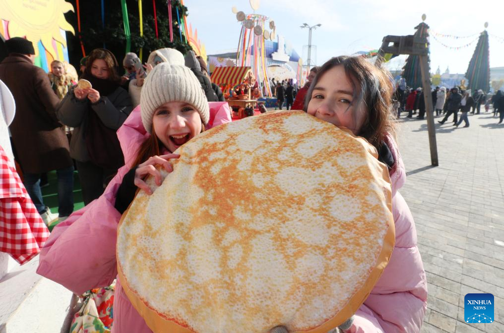 A staff member presents pancakes during the celebration of Maslenitsa, a religious holiday marking the end of winter and the beginning of spring, in Minsk, Belarus, Feb. 21, 2026. (Photo by Henadz Zhinkov/Xinhua)