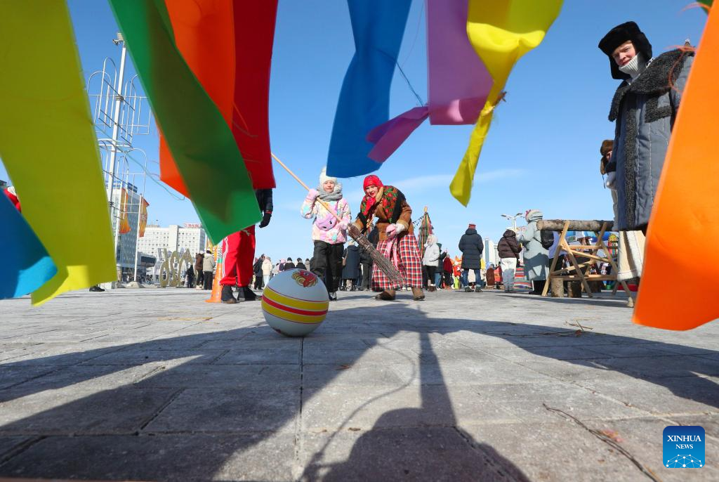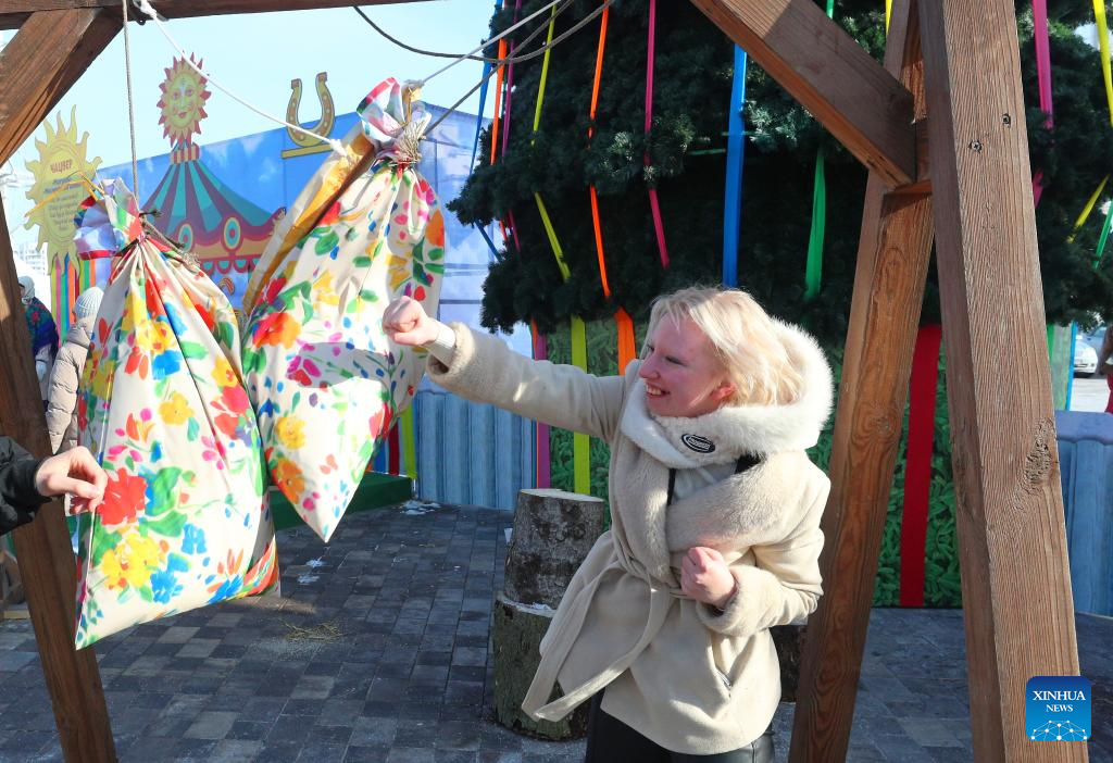 People participate in a game during the celebration of Maslenitsa, a religious holiday marking the end of winter and the beginning of spring, in Minsk, Belarus, Feb. 21, 2026. (Photo by Henadz Zhinkov/Xinhua)