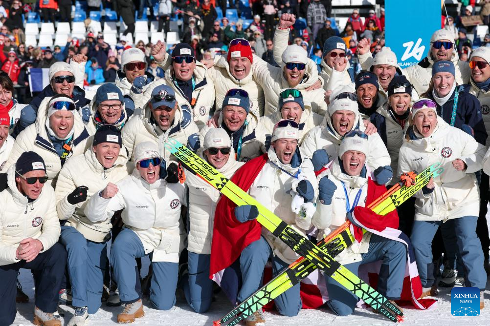 Members of Team Norway celebrate after the biathlon men's 15km mass start event at the 2026 Milan-Cortina Winter Olympics in Anterselva, Italy, Feb. 20, 2026. (Xinhua/Zhang Tao)