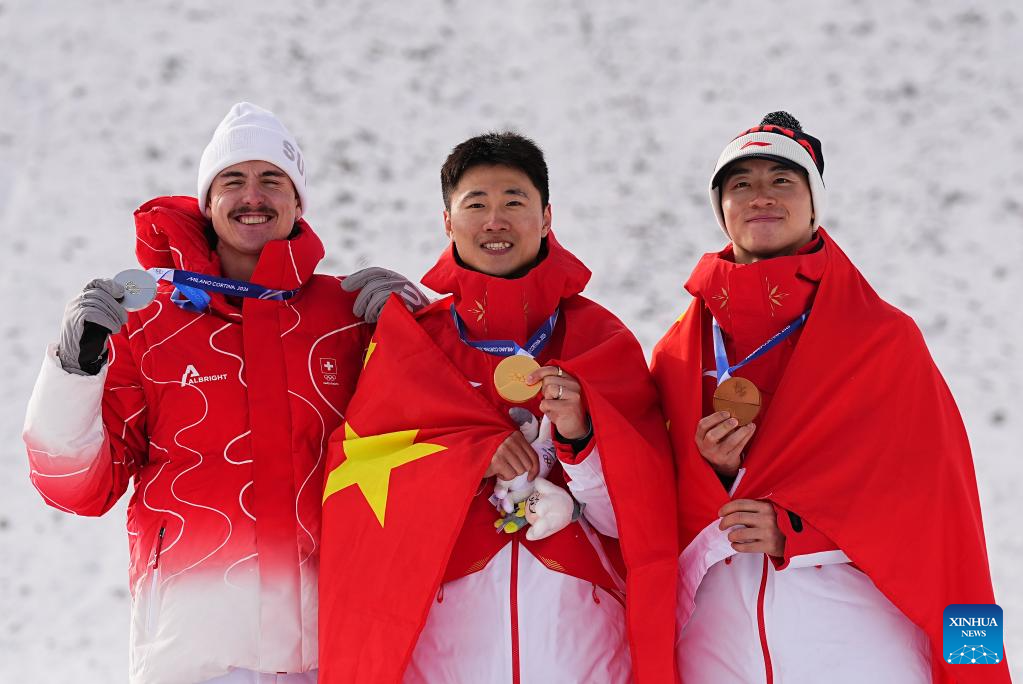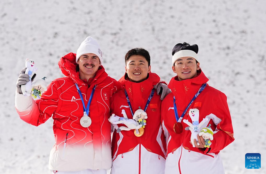 Silver medalist Noe Roth of Switzerland, gold medalist Wang Xindi of China and his teammate bronze medalist Li Tianma (L to R) pose during the awarding ceremony of the freestyle skiing men's aerials at the Milan-Cortina 2026 Olympic Winter Games in Livigno, Italy, Feb. 20, 2026. (Xinhua/Wu Huiwo)