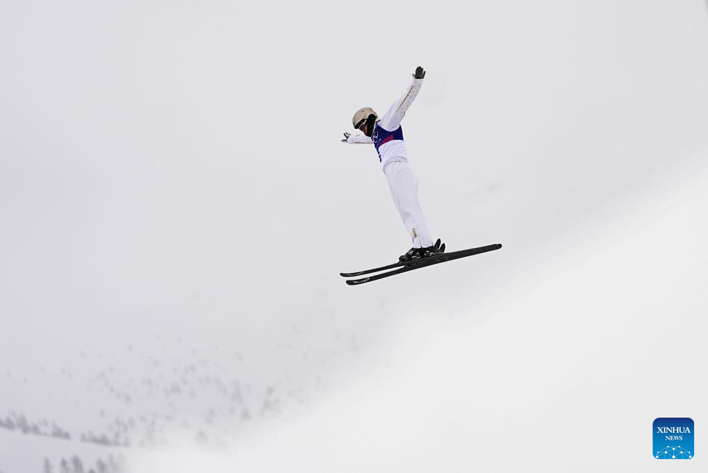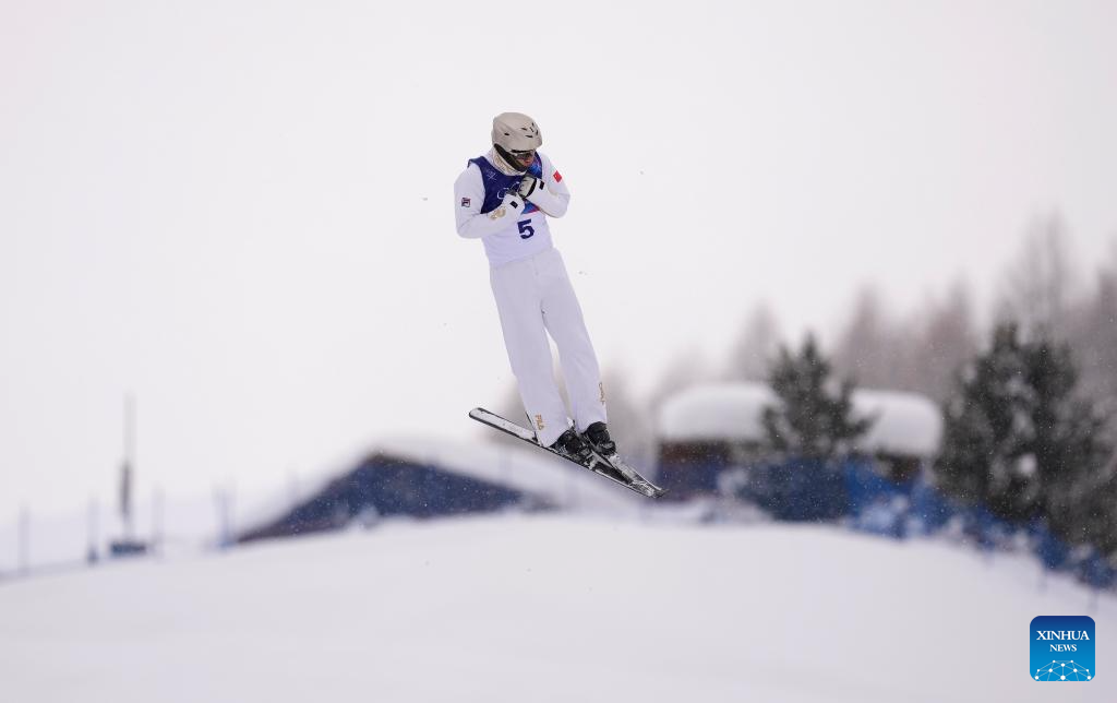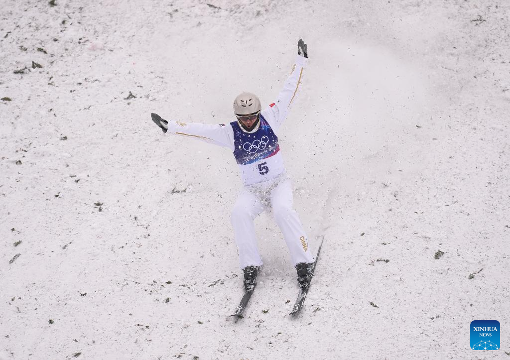 Wang Xindi of China competes during the freestyle skiing men's aerials final 2 at the Milan-Cortina 2026 Olympic Winter Games in Livigno, Italy, Feb. 20, 2026. (Xinhua/Hu Chao)