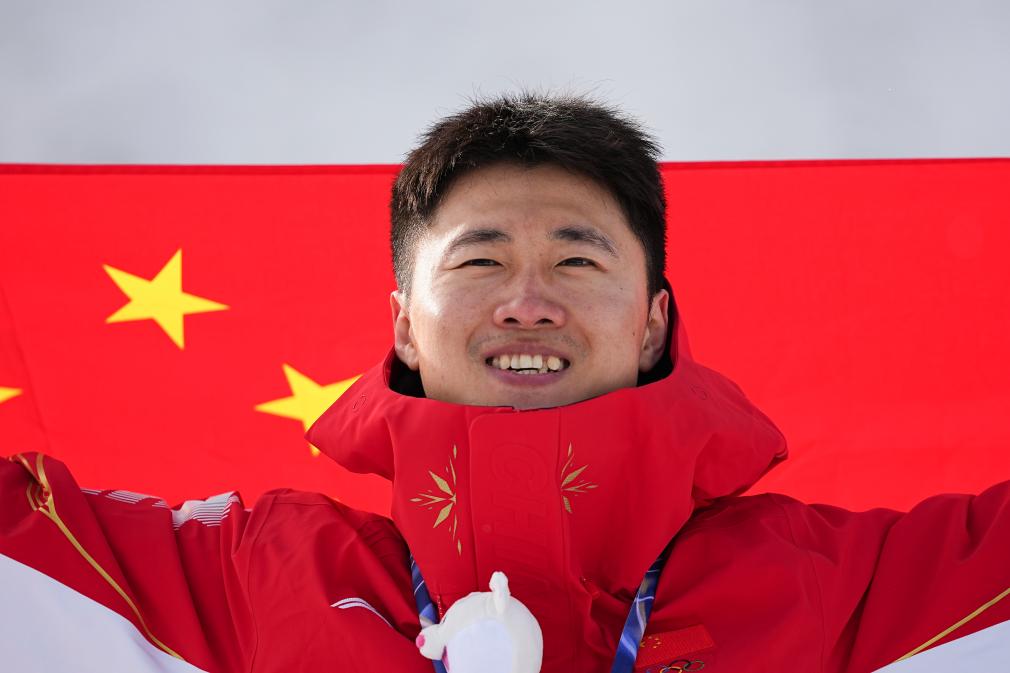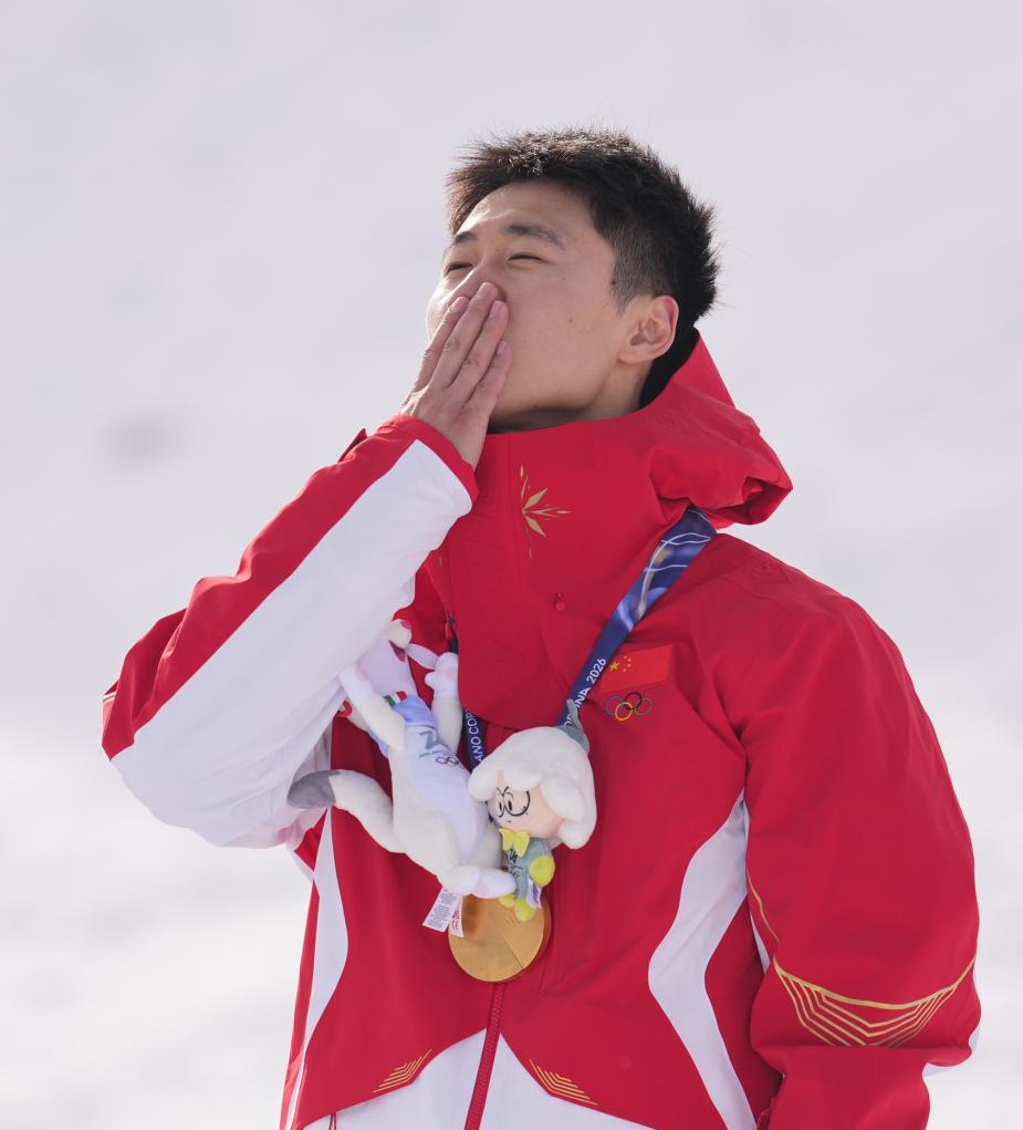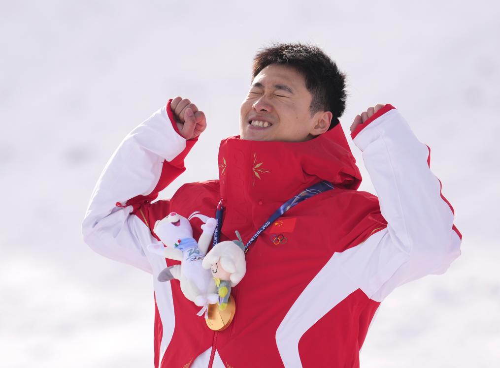 Gold medalist Wang Xindi of China celebrates during the awarding ceremony of the freestyle skiing men's aerials at the Milan-Cortina 2026 Olympic Winter Games in Livigno, Italy, Feb. 20, 2026. (Xinhua/Wu Huiwo)
