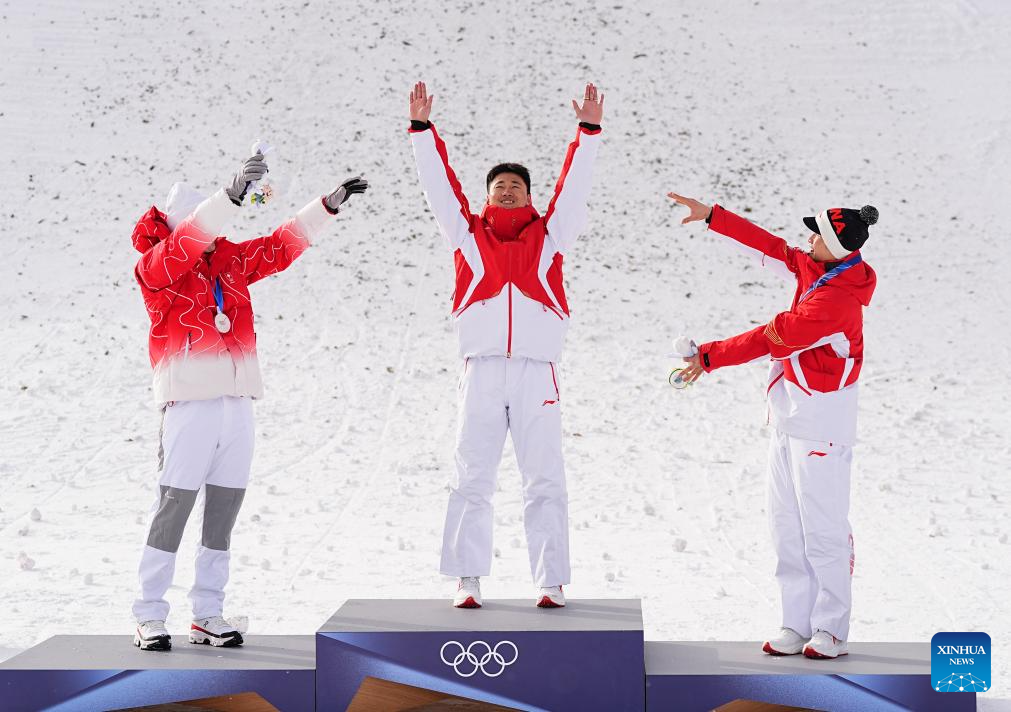 Gold medalist Wang Xindi (C) of China reacts during the awarding ceremony of the freestyle skiing men's aerials at the Milan-Cortina 2026 Olympic Winter Games in Livigno, Italy, Feb. 20, 2026. (Xinhua/Wu Huiwo)