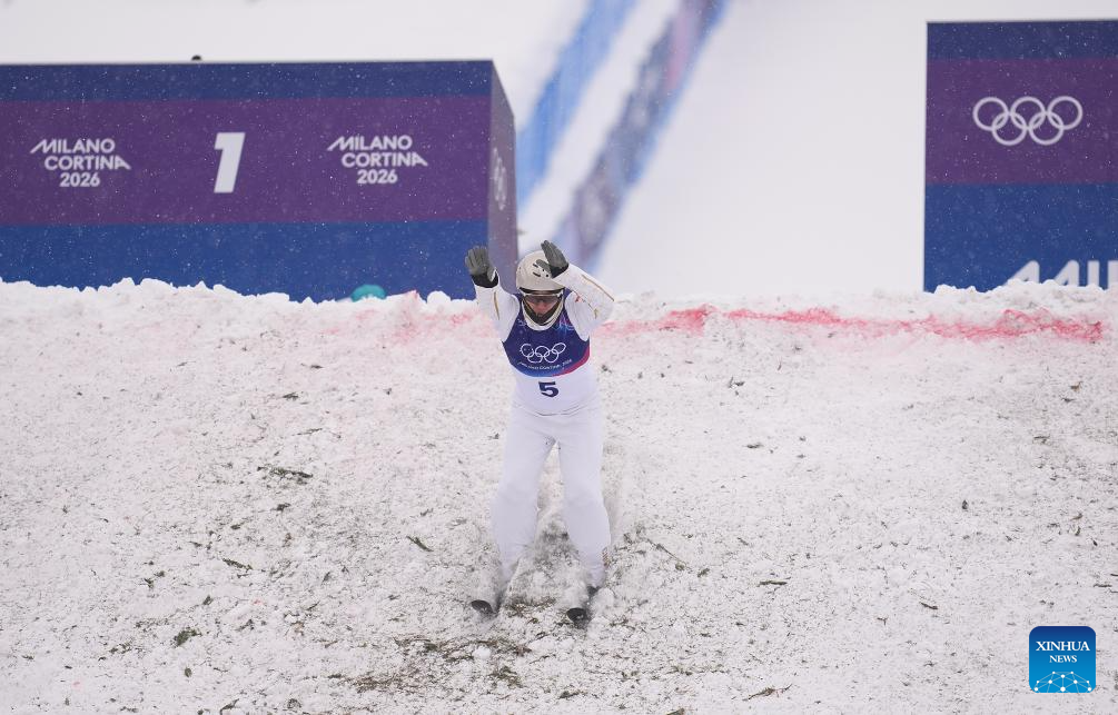 Wang Xindi of China reacts during the freestyle skiing men's aerials qualification 1 at the Milan-Cortina 2026 Olympic Winter Games in Livigno, Italy, Feb. 20, 2026. (Xinhua/Hu Chao)