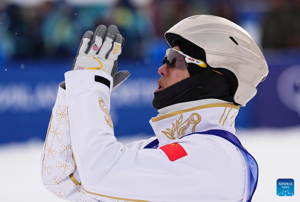 Gold medalist Wang Xindi of China celebrates winning after the freestyle skiing men's aerials final 2 at the Milan-Cortina 2026 Olympic Winter Games in Livigno, Italy, Feb. 20, 2026. (Xinhua/Wu Huiwo)