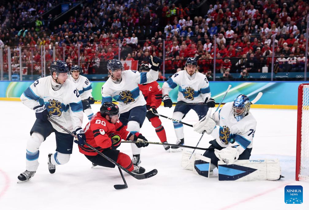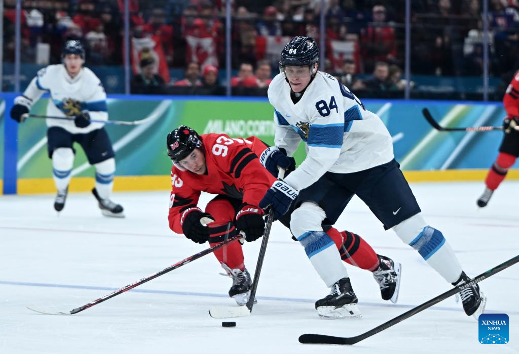 Sam Bennett (2nd L) of Canada vies for the puck during the ice hockey men's play-offs semifinal match between Canada and Finland at the Milan-Cortina 2026 Olympic Winter Games in Milan, Italy, Feb. 20, 2026. (Xinhua/Wang Kaiyan)