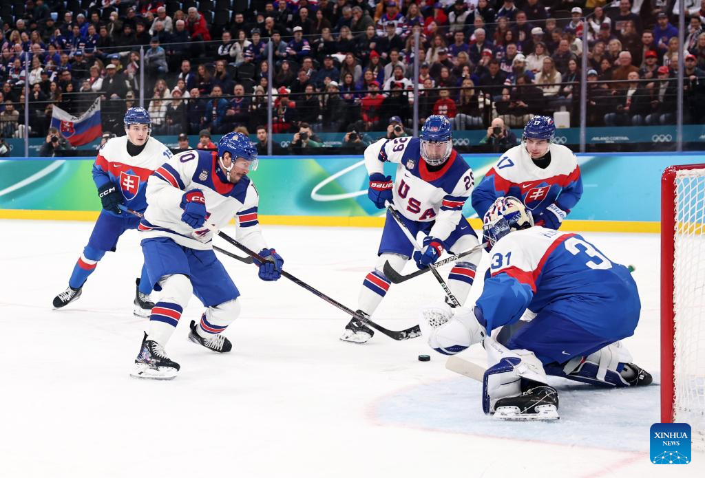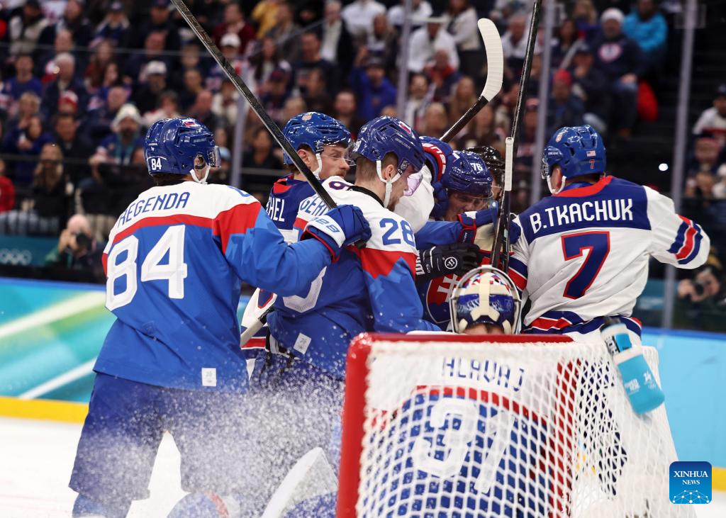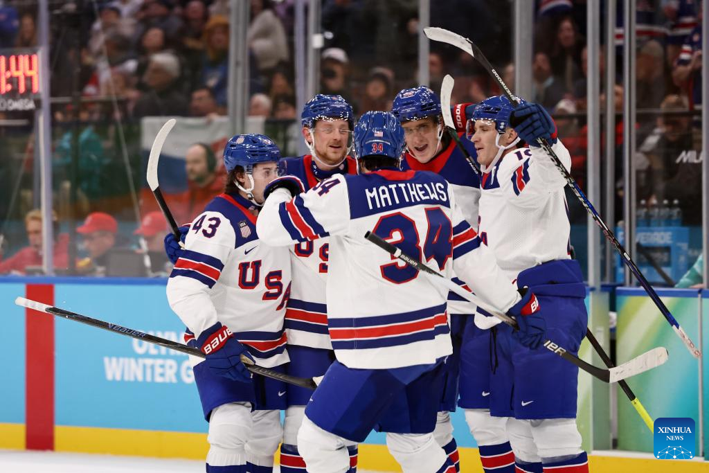Players of the United States celebrate a goal during the ice hockey men's play-offs semifinal match between the United States and Slovakia at the Milan-Cortina 2026 Olympic Winter Games in Milan, Italy, Feb. 20, 2026. (Xinhua/Wang Kaiyan)