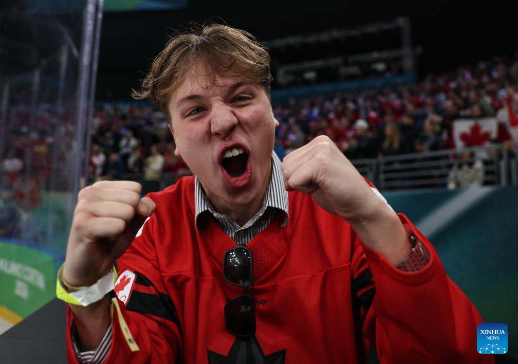 A spectator celebrates the winning of Team Canada after the ice hockey men's play-offs semifinal match between Canada and Finland at the Milan-Cortina 2026 Olympic Winter Games in Milan, Italy, Feb. 20, 2026. (Xinhua/Wang Kaiyan)