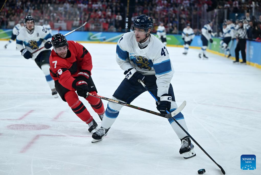 Miro Heiskanen (R) of Finland competes during the ice hockey men's play-offs semifinal match between Canada and Finland at the Milan-Cortina 2026 Olympic Winter Games in Milan, Italy, Feb. 20, 2026. (Xinhua/Zhang Haofu)