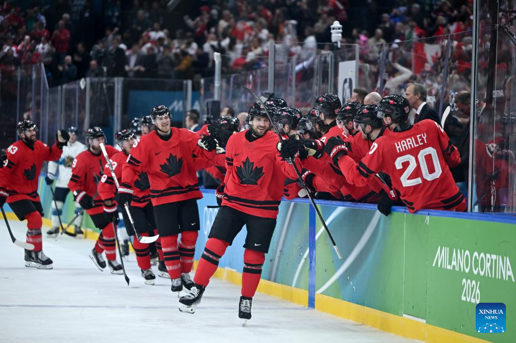 Players of Canada celebrate after the ice hockey men's play-offs semifinal match between Canada and Finland at the Milan-Cortina 2026 Olympic Winter Games in Milan, Italy, Feb. 20, 2026. (Xinhua/Wang Kaiyan)