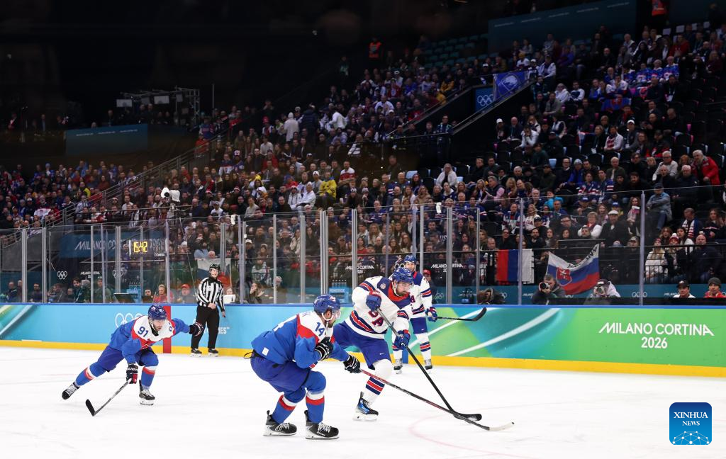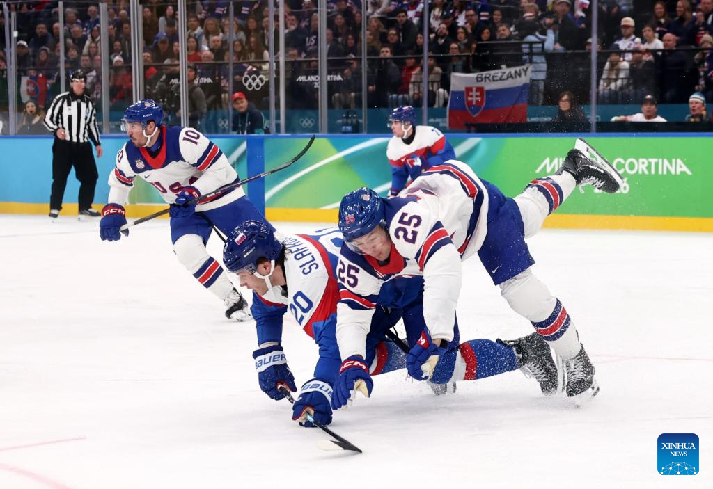 Players of both teams fight during the ice hockey men's play-offs semifinal match between the United States and Slovakia at the Milan-Cortina 2026 Olympic Winter Games in Milan, Italy, Feb. 20, 2026. (Xinhua/Wang Kaiyan)