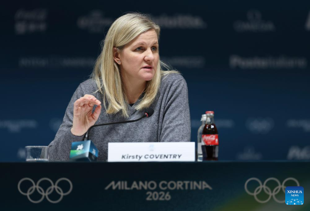 International Olympic Committee (IOC) President Kirsty Coventry attends a press conference in Milan, Italy, Feb. 20, 2026. (Xinhua/Hu Xingyu)