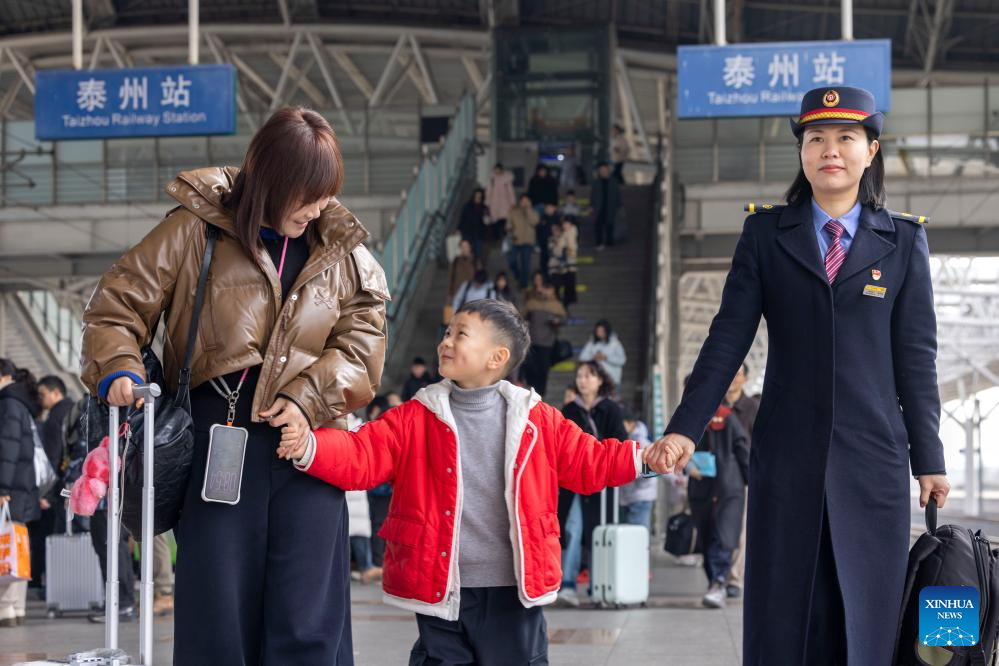 A staff member helps passengers board a train at Taizhou Railway Station in Taizhou City, east China's Jiangsu Province, Feb. 19, 2026. During China's Spring Festival travel season, civil aviation, railway, and other departments have increased transportation capacity and optimized convenient services such as air-rail intermodal transport, quiet carriages, luggage delivery, and priority channels for vulnerable groups, taking multiple measures to ensure passengers' safe and smooth travel. (Photo by Tang Dehong/Xinhua)