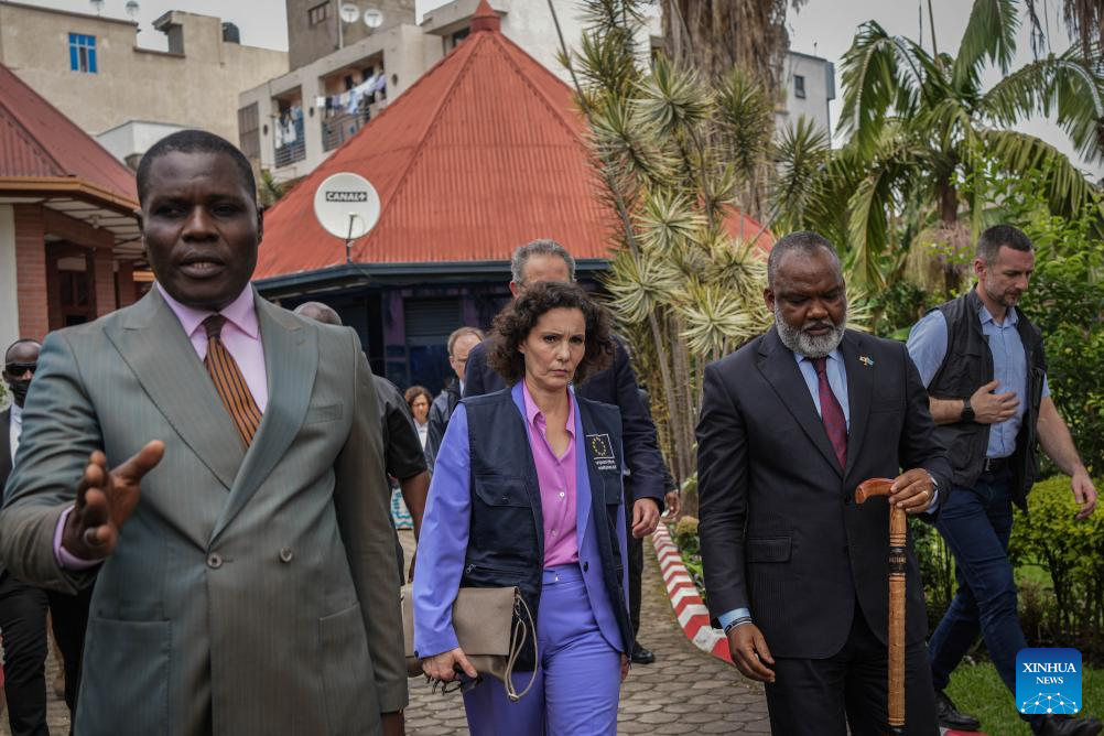 European Commissioner for Equality, Preparedness and Crisis Management Hadja Lahbib (front, 2nd L) and Corneille Nangaa (2nd R), leader of the Congo River Alliance, a politico-military coalition allied with the March 23 Movement, are seen in Goma, eastern Democratic Republic of the Congo (DRC), on Feb. 20, 2026. A European Union commissioner on Friday warned of a "catastrophic" humanitarian situation in eastern DRC, a claim swiftly pushed back by a rebel leader who accused government-held areas of facing the worst conditions. (Str/Xinhua)