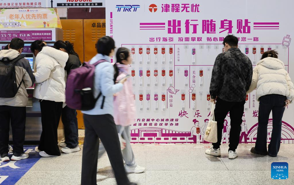 This photo taken on Feb. 19, 2026 shows an information board set for the convenience of passengers at the metro station of Tianjin West Railway Station in north China's Tianjin. During the Spring Festival travel season, civil aviation, railway, and other departments have increased transportation capacity and optimized convenient services such as air-rail intermodal transport, quiet carriages, luggage delivery, and priority channels for vulnerable groups, taking multiple measures to ensure passengers' safe and smooth travel. (Xinhua/Li Ran)