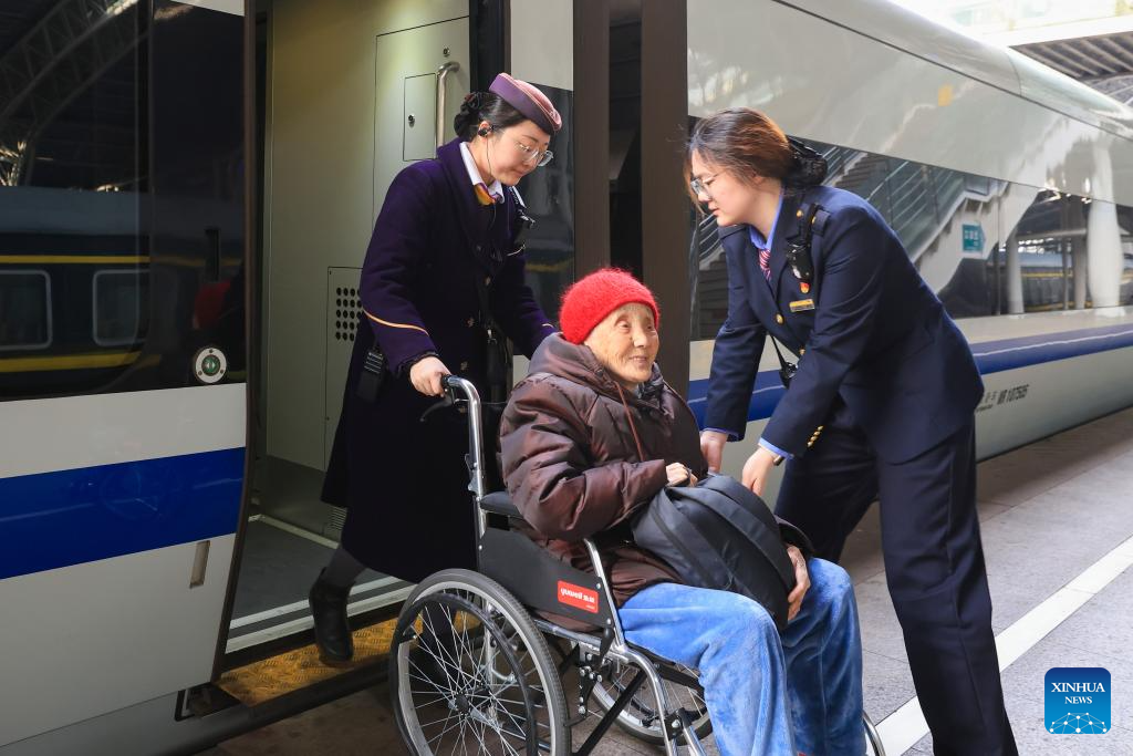 Staff members help an elderly passenger board a train at Nanjing Railway Station in Nanjing City, east China's Jiangsu Province, Feb. 19, 2026. During the Spring Festival travel season, civil aviation, railway, and other departments have increased transportation capacity and optimized convenient services such as air-rail intermodal transport, quiet carriages, luggage delivery, and priority channels for vulnerable groups, taking multiple measures to ensure passengers' safe and smooth travel. (Photo by Su Yang/Xinhua)