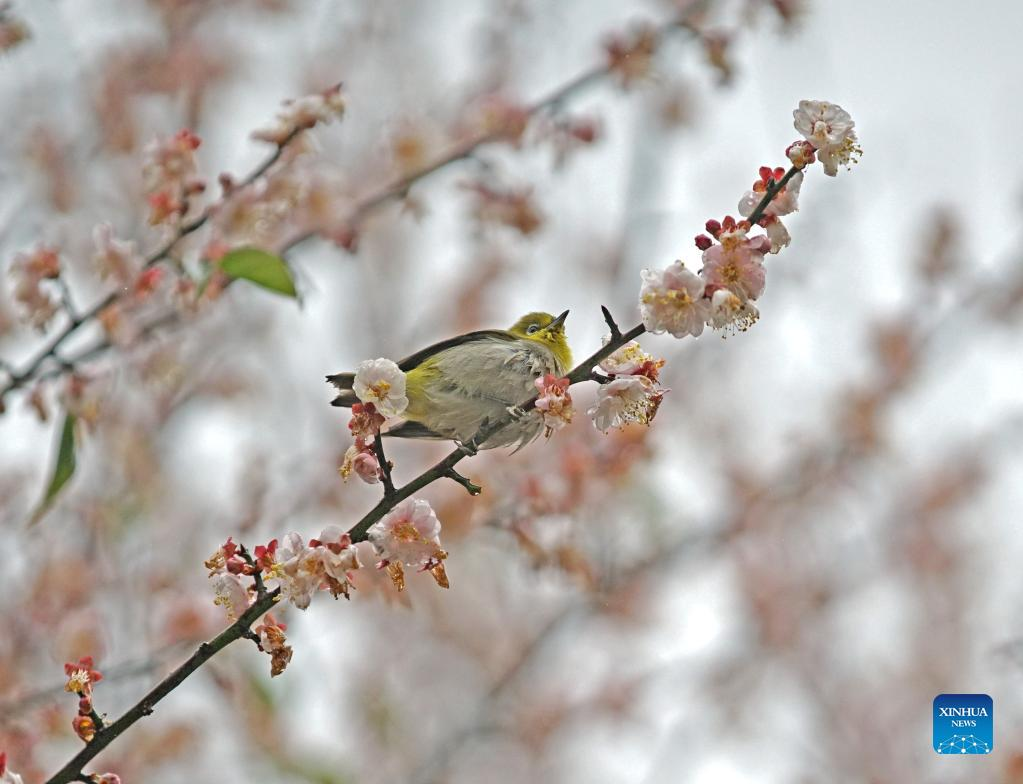 A bird perches on a branch of a plum tree in Qingxiu Mountain scenic area in Nanning, south China's Guangxi Zhuang Autonomous Region, Feb. 13, 2022. The Qingxiu Mountain scenic area has attracted many tourists as plum trees are in blossom in early spring. (Xinhua/Zhou Hua)