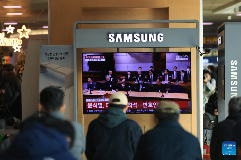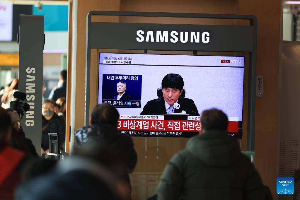 People watch a televised news report on Yoon Suk-yeol's court trial at Seoul Railway Station in Seoul, South Korea, Feb. 19, 2026. South Korea's former President Yoon Suk-yeol was sentenced to life in prison on charges of insurrection stemming from his declaration of emergency martial law, live footage showed Thursday.The Seoul Central District Court delivered its ruling, which was broadcast live to the public, saying the crux of Yoon's martial law case was the fact that troops were deployed to the National Assembly. (Photo by Park Jintaek/Xinhua)