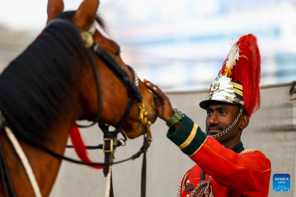 A Nepalese Army cavalry soldier prepares a horse ahead of the 76th National Democracy Day celebrations in Kathmandu, Nepal, Feb. 19, 2026. (Photo by Sulav Shrestha/Xinhua)
