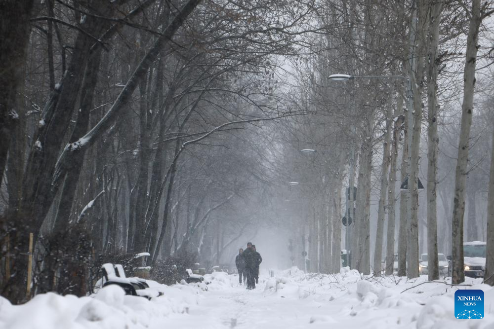 People walk amid snowfall on a snow-covered alley in Bucharest, Romania, on Feb. 21, 2026. Heavy snow, strong winds and icy conditions on Saturday again affected roads, maritime ports and power supplies across southern and eastern Romania, according to authorities. (Photo by Cristian Cristel/Xinhua)
