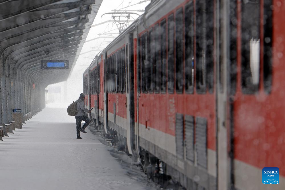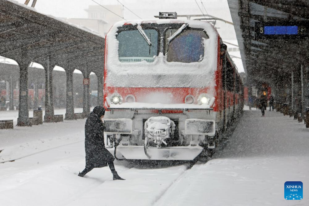 A passenger boards a train amid snowfall at North Railway station in Bucharest, Romania, on Feb. 21, 2026. Heavy snow, strong winds and icy conditions on Saturday again affected roads, maritime ports and power supplies across southern and eastern Romania, according to authorities. (Photo by Cristian Cristel/Xinhua)