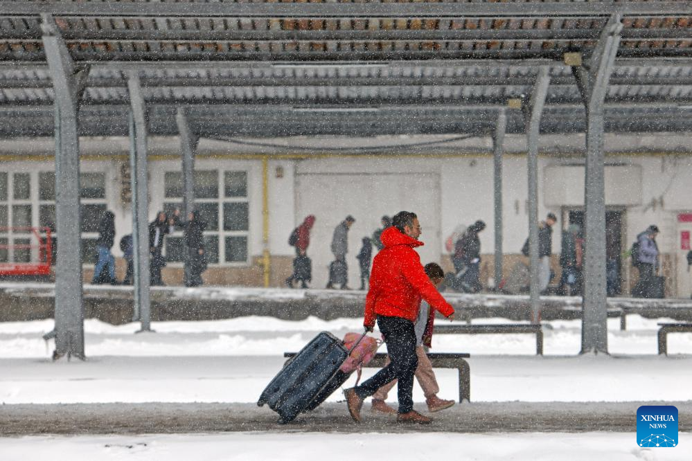 People carry their luggage amid snowfall on a platform at North Railway station in Bucharest, Romania, on Feb. 21, 2026. Heavy snow, strong winds and icy conditions on Saturday again affected roads, maritime ports and power supplies across southern and eastern Romania, according to authorities. (Photo by Cristian Cristel/Xinhua)
