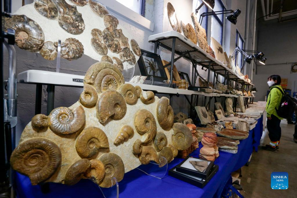 A visitor looks at fossil stones during the Gem and Mineral Show in Vancouver, British Columbia, Canada, on March 25, 2022. The three-day show features about 100 vendors from across Canada with their gem, mineral and rare fossil collections. (Photo by Liang Sen/Xinhua)