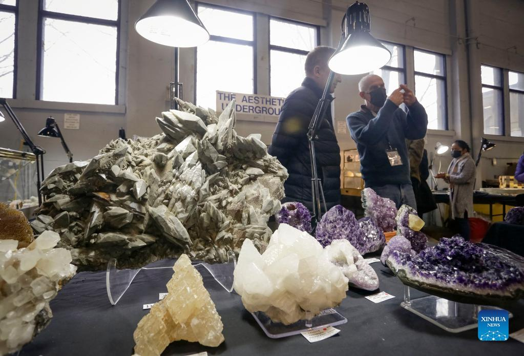 People look at gemstones displayed at a booth while visiting the Gem and Mineral Show in Vancouver, British Columbia, Canada, on March 25, 2022. The three-day show features about 100 vendors from across Canada with their gem, mineral and rare fossil collections. (Photo by Liang Sen/Xinhua)