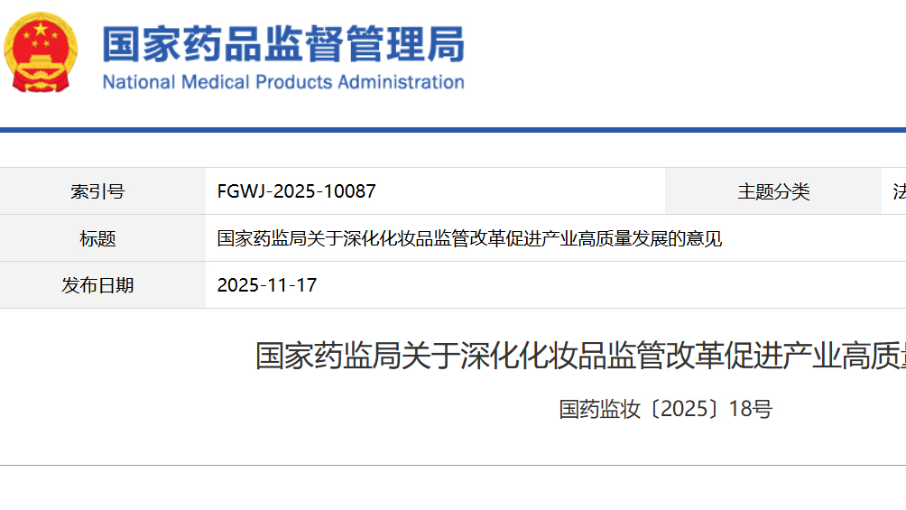國(guó)家藥監(jiān)局關(guān)于深化化妝品監(jiān)管改革促進(jìn)產(chǎn)業(yè)高質(zhì)量發(fā)展的意見(jiàn) 國(guó)藥監(jiān)妝〔2025〕18號(hào)
