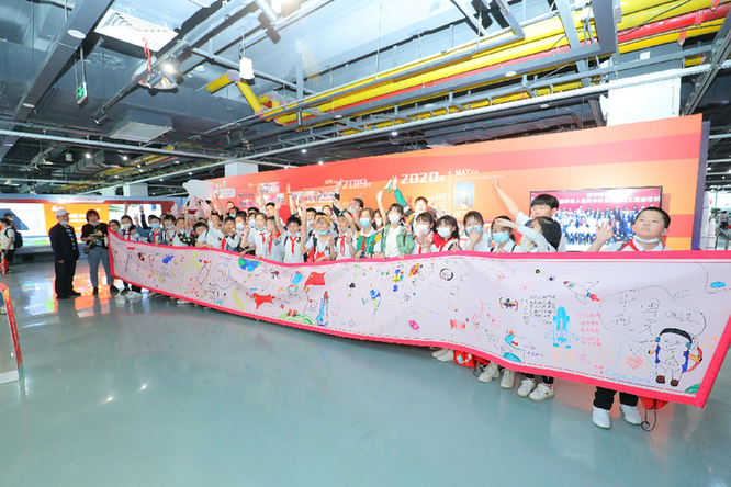 在現(xiàn)場(chǎng),為了慶祝這場(chǎng)期待已久的航天科普展開幕,孩子們用一份“特別的禮物”——一幅繪滿了航天夢(mèng)想與武漢名勝的5米長(zhǎng)卷獻(xiàn)禮中國(guó)航天。在這幅長(zhǎng)卷上,孩子們不僅生動(dòng)地描繪出了武漢的眾多名勝特色,還用天馬行空的想象力展現(xiàn)了自己的航天夢(mèng)。展區(qū)內(nèi),孩子們?cè)谥v解員的帶領(lǐng)下參觀形形色色的“國(guó)之重器”,了解中國(guó)航天發(fā)展史,并且通過VR等設(shè)備親自體驗(yàn)了一把“太空旅行”。在航天夢(mèng)想體驗(yàn)營(yíng)中,孩子們一起回顧了空間站發(fā)射的精彩瞬間,當(dāng)看到“長(zhǎng)五B”成功升空時(shí),現(xiàn)場(chǎng)爆發(fā)出熱烈的歡呼和掌聲,加油聲此起彼伏,許多孩子還合唱《明天會(huì)更好》對(duì)中國(guó)航天獻(xiàn)上祝福。