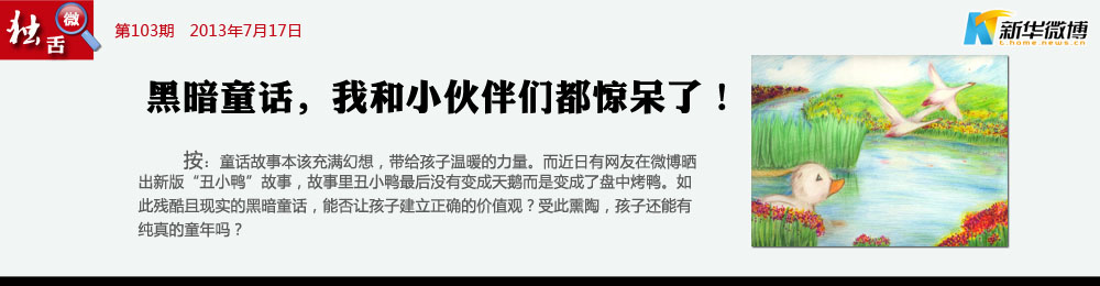 【黑暗童話也有正能量】 兒童閱讀黑暗童話——丑小鴨變烤鴨并不可怕,這是一種挫折教育。孩子的成長需要適度的挫折教育。一直活在象牙塔里的孩子,在走入社會之后很難適應(yīng)現(xiàn)實的生活,他們常常因為學(xué)業(yè)或工作中的一點挫折而走向極端。因此,在其進入社會之前進行適度的挫折教育必不可少。